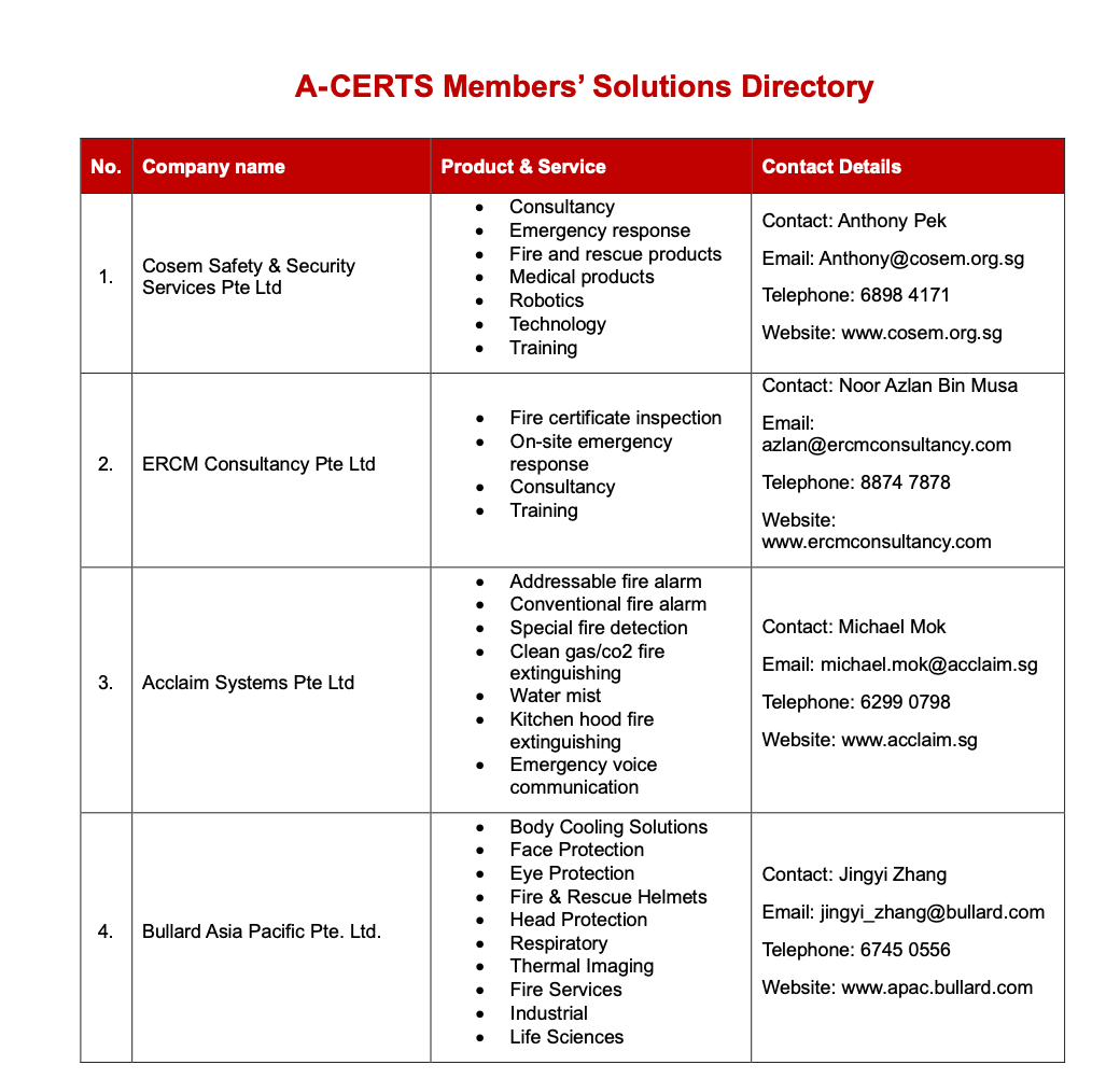 A-CERTS is proud to present this Industry Solutions Directory – a platform that showcases the products, services, and capabilities of our valued Corporate Members who are actively supporting the fire safety, emergency preparedness, and business continuity landscape in Singapore.